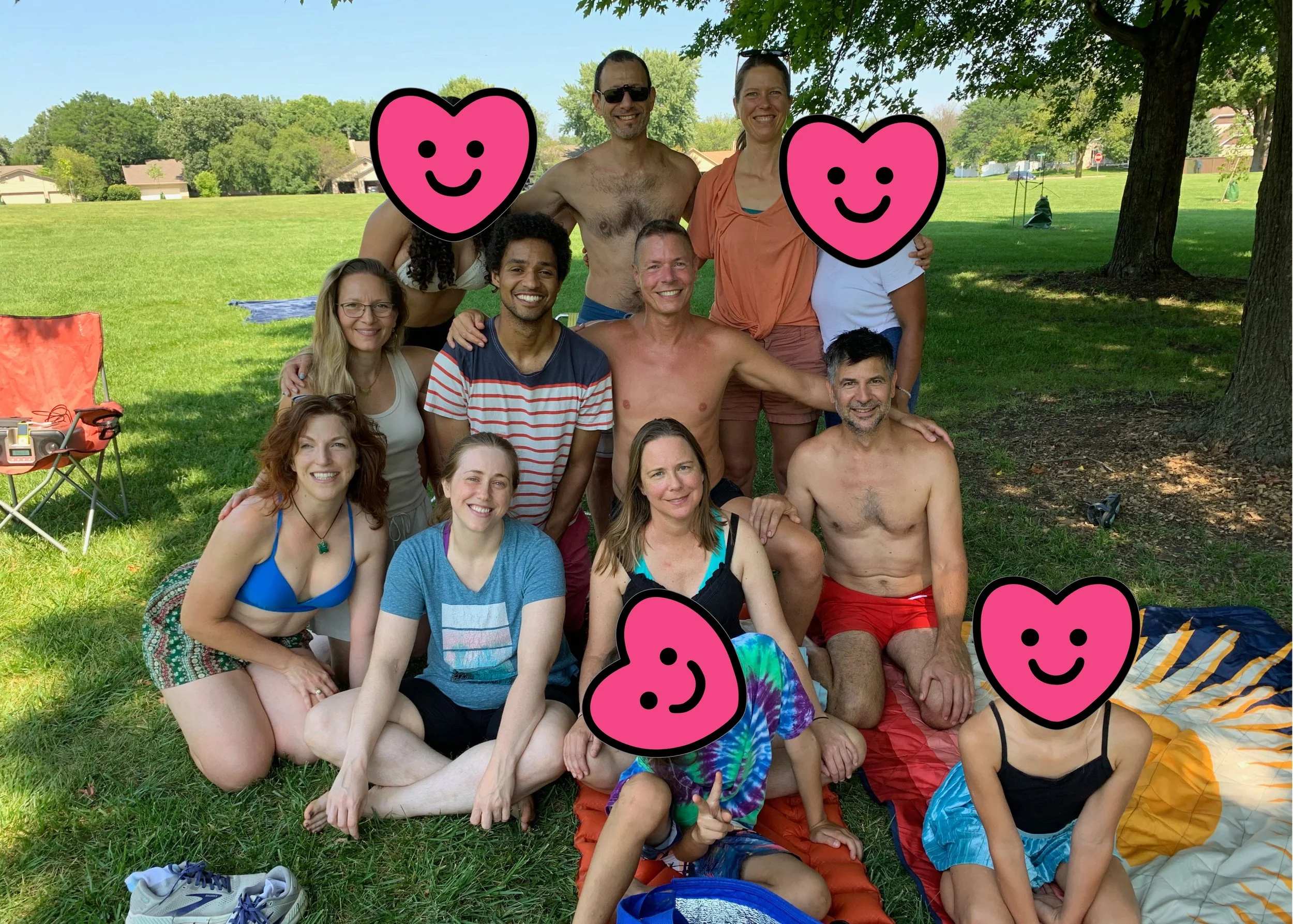Top row, left to right: Hannah’s teenage daughter, Thomas, C-Star, a good friend. Middle Row: Hannah, Seb, me, Tal. Bottom row: Natalie, Lisa, Angie. Out front: Thomas’ kiddo and C-Star’s kiddo.