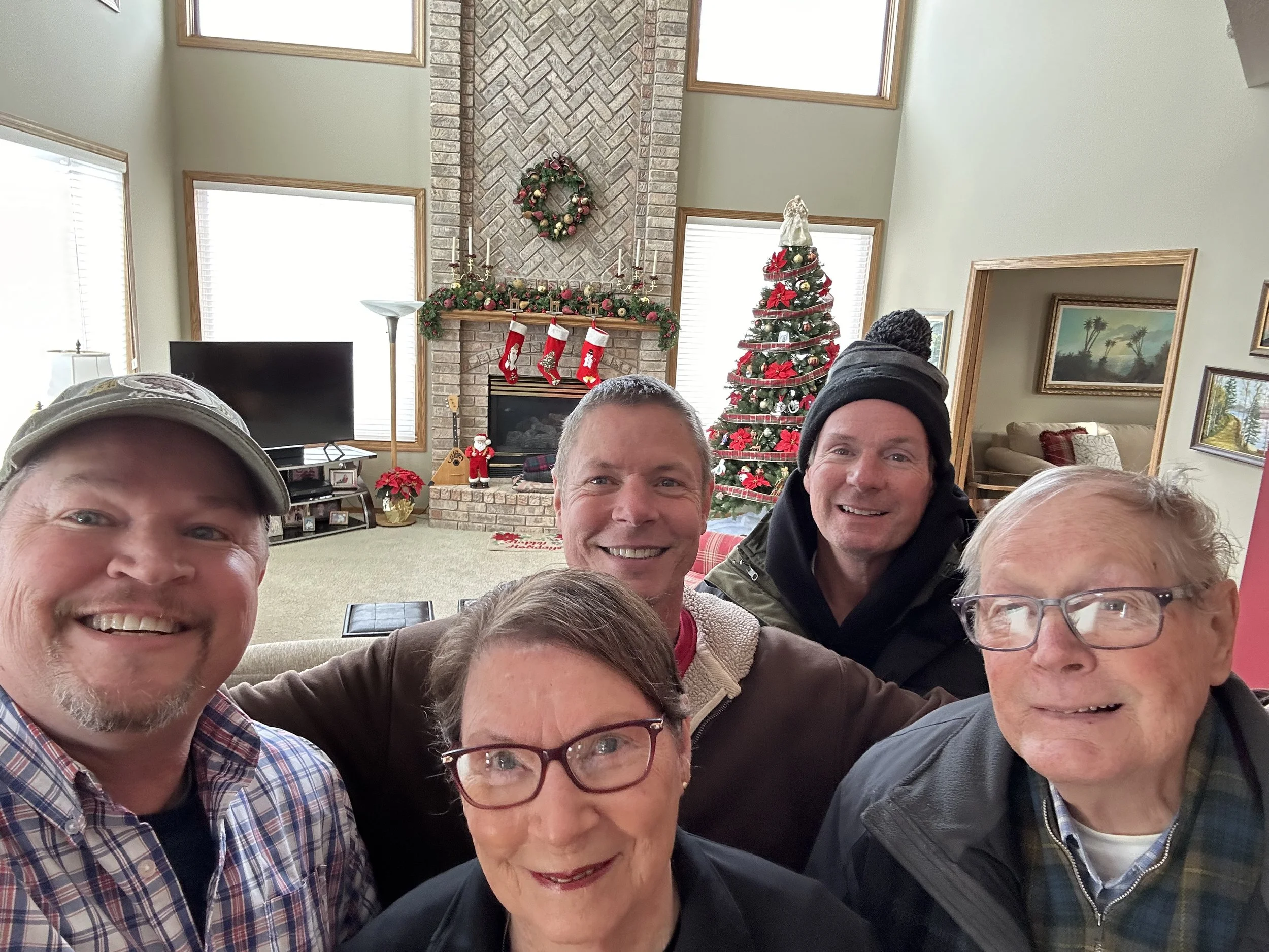 My brothers visited this December. Here is a family pic. Left to right: Steve (older bro), Mom, me, Mike (eldest bro), Dad.